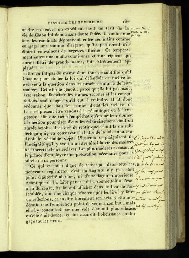 Termine o passo postillato: Il n'en fut pas de même d'un tour de subtilité qu'il imagina pour éluder la loi qui défendoit de mettre les esclaves à la question dans les procés criminels de leurs maîtres. Cette loi le gênoit, parce qu'elle lui paroissoit, avec raison, favoriser les trames secrètes et les conspirations, seul danger qu'il eut à craindre. Il fit donc ordonner que dans les crimes d'état les esclaves de l'accusé pussent être vendus à la république ou à l'empereur, afin que rien n'empêchât qu'on ne leur donnât la question pour tirer d'eux les éclaircissemens dont on auroit besoin. Il est aisé de sentir que c'étoit là un subterfuge qui, en conservant la lettre de la loi, en anéantissait le véritable objet. Plusieurs se plaignirent de l'indignité qu'il y avait à mettre ainsi la vie des maîtres à la merci de leurs esclaves. Les plus modérés excusoient le prince d'employer une précaution nécessaire pour la sûreté de sa personne.